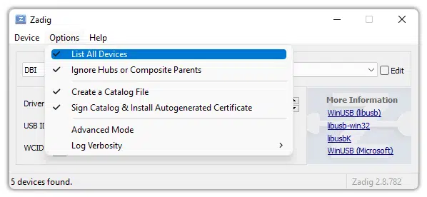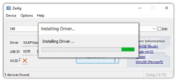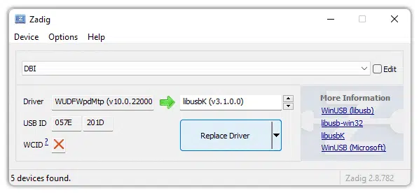 Sur le pc lancez Zadig 2.8 faite Options et List All Device vous devriez voir DBI sélectionnez le c’est la switch, si il y as simplement nintendo switch c’est bon aussi.